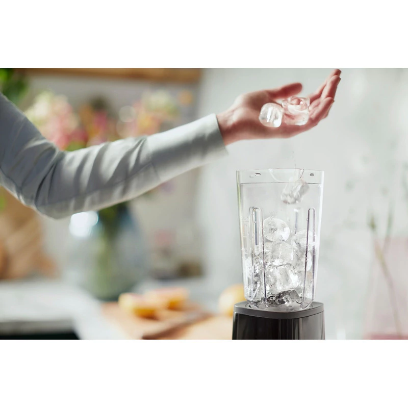 Ahorre espacio con el práctico sistema de almacenamiento del cable bajo la cubierta de la licuadora.